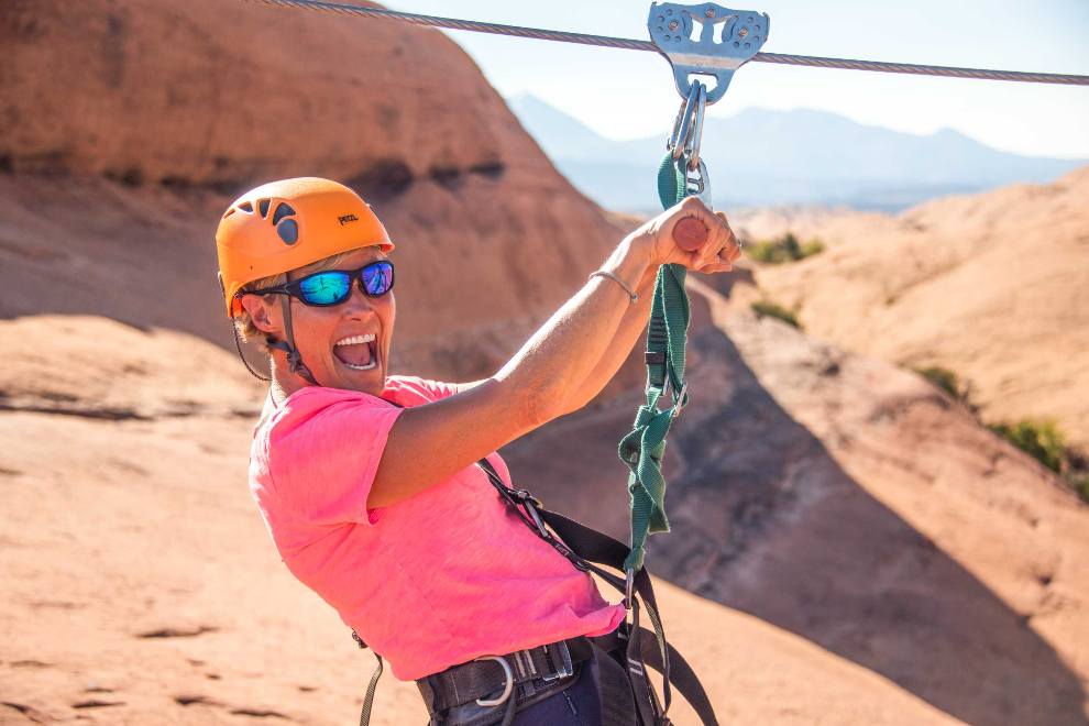 Our tour includes 4-miles of off road adventure, cruising straight-aways and crawling rock formations in 4WD UTV's. Our exclusive trail leads to 300-acres of private property atop the red rock fins, with spectacular views to the La Sal Mountains, Arches National Park and the Colorado River Canyon. Our course was strategically designed to create the ultimate experience for our guests, starting slow and sweet, and building to an exhilarating ΒΌ-mile of zip line with some serious speed!